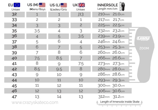 The Zoom by the Crazy Skate company brings sleek lines to its new high performance speed skate offering. Built with a wide fit, padded boot that offers plenty of toe room – this speed style boot offers comfort and performance with effortless style.