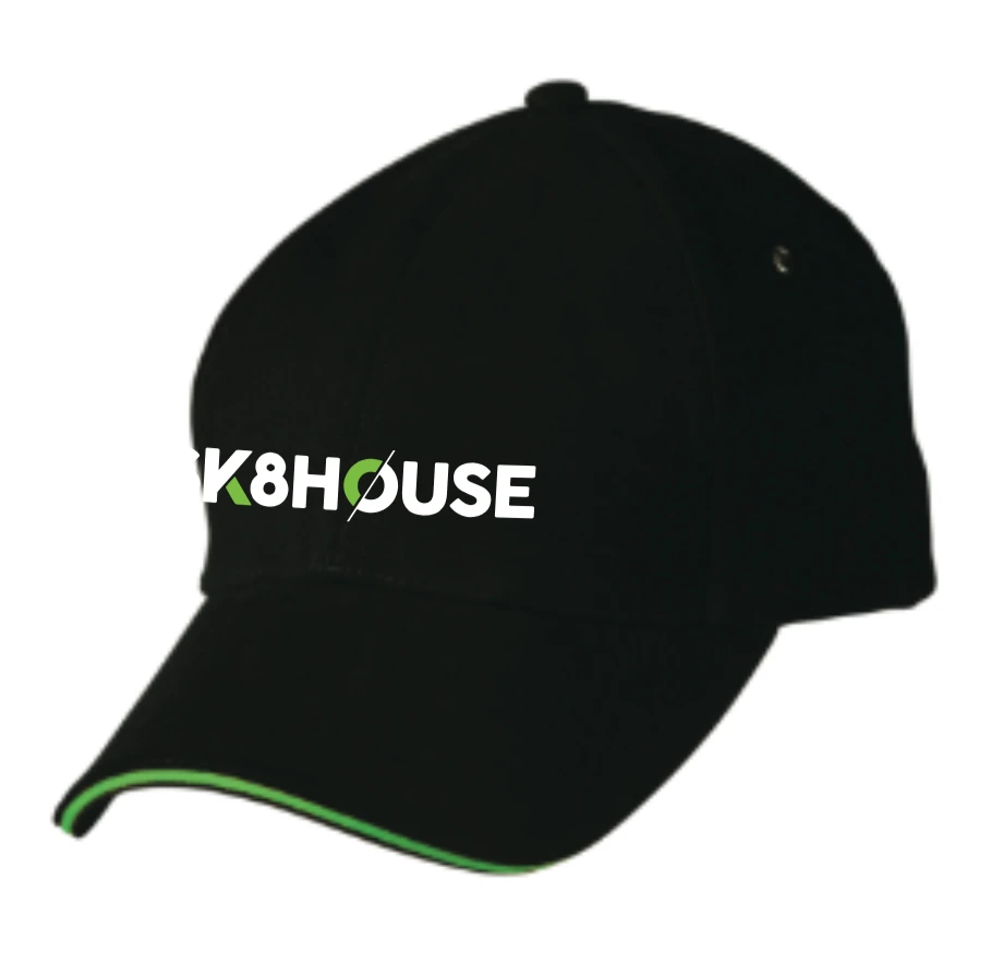 - Colour: Black with green trim, fully embroidered Sk8house Logo.