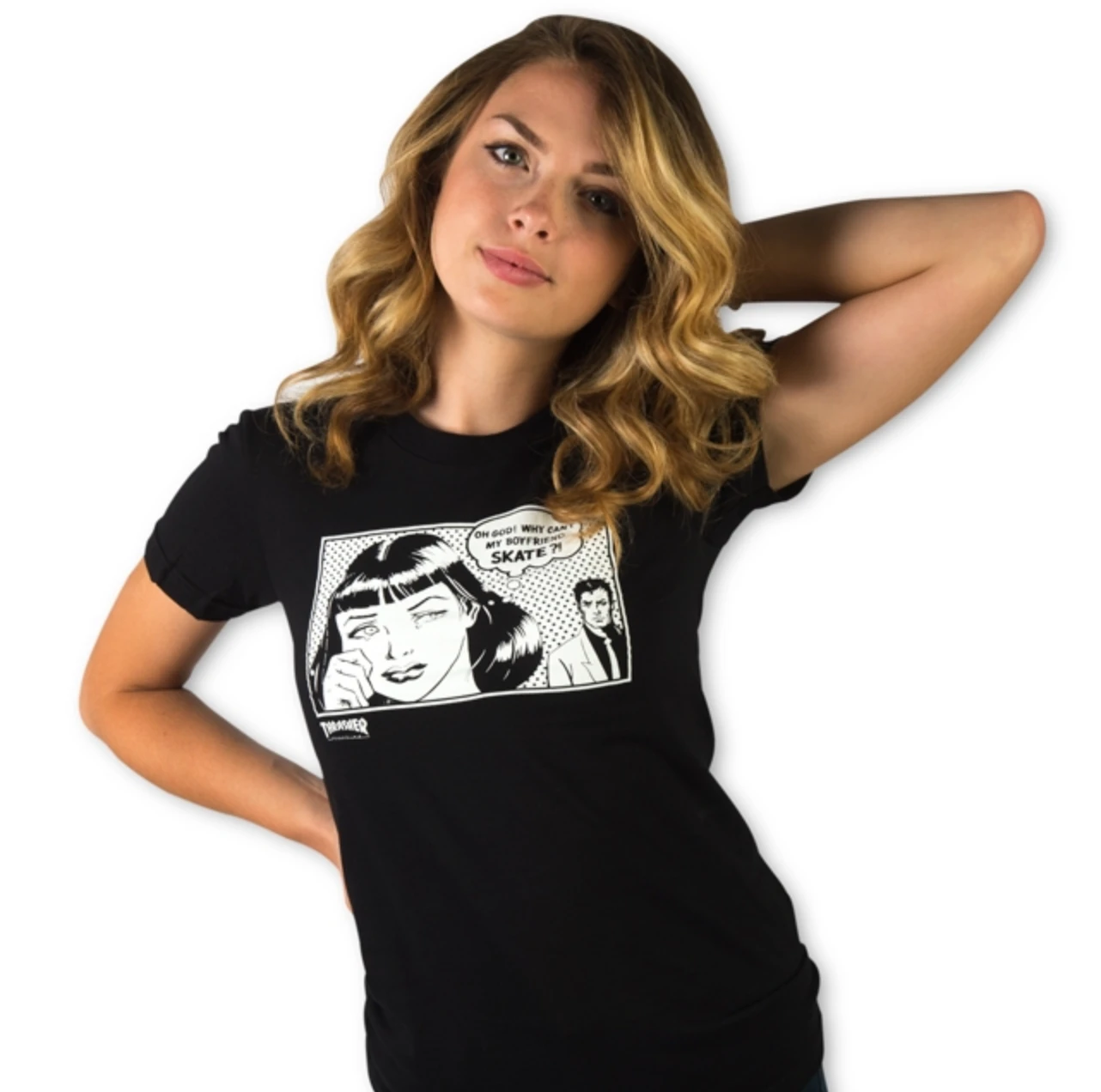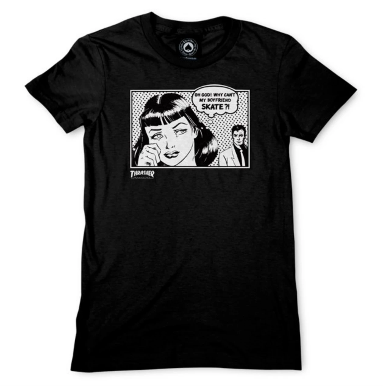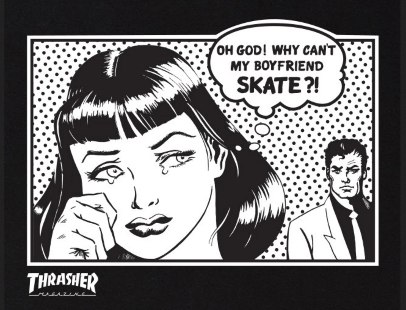 - Features the classic, “Why can’t my boyfriend skate?” graphic.
